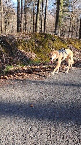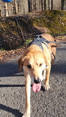 7 avril 2026: Me revoici déjà pour les dernières (bonnes) nouvelles. Je me suis décidée hier à forcer Buckley pour lui mettre son harnais. Ça n’a pas été une mince affaire, il courait tout côté pour me fuir, j’ai dû le « coincer » et le tenir par son collier, il s’est débattu, j’ai dû « gronder », là il a fini par se laisser faire. La voiture, un peu stressant, mais il était avec un de mes chiens. Mais dès le début de la balade, dans les bois, un amour. Il a vraiment été extra! Je lui avais mis une longe de 15 m, comme ça il pouvait marcher sans se sentir directement retenu, ce qu’il déteste. Nous avons marché une bonne heure, il a été génial tout le long. Nous avons rencontré un promeneur, Buckley a été directement vers lui, le monsieur a pu le caresser doucement. Nous avons croisé des cyclistes, aucune réaction négative ! Mais nous avons croisé un homme avec son chien, qui n’était pas très sympathique ( il aboyait et grognait) ce qui a fait un peu peur à Buckley. Mais il s’est juste + éloigné, il n’a pas aboyé ou grogné en retour. Puis on a croisé un promeneur avec 2 grands lévriers hafgans qui eux étaient trop sociable et sont arrivés direct vers mes 2 chiens. Même mon Jiji qui est très sociable n’était pas très à l’aise. Mais pour une première, je l’ai vraiment trouvé top! Il a adoré sa balade !