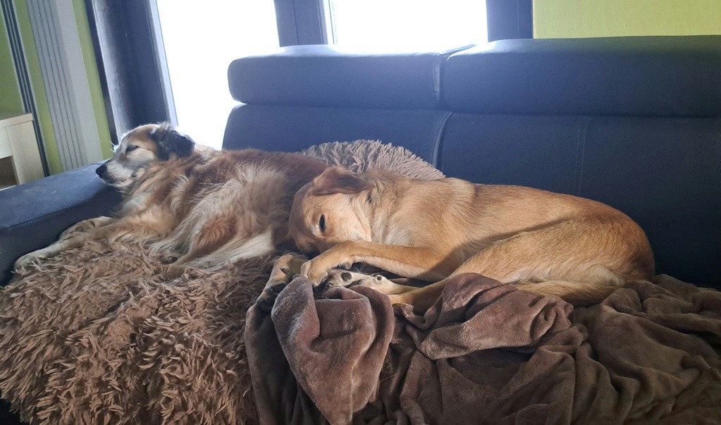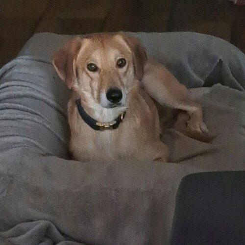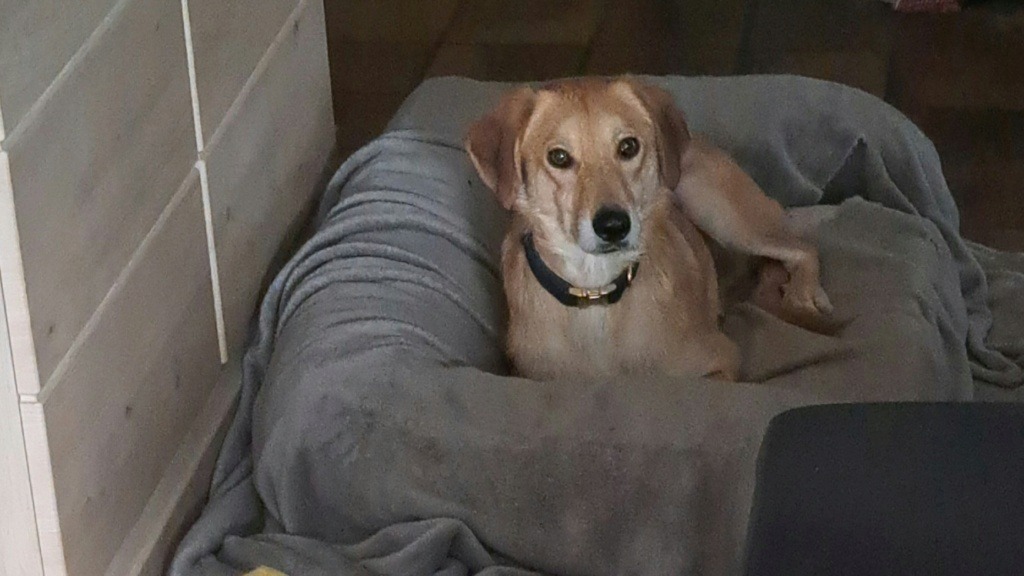 26 mars 2026 : Buckley fait partie des chiens qui régressent après leur arrivée. Car si son arrivée semblait prometteuse, il est devenu plus peureux et a commencé à s’isoler de plus en plus dans ma chambre. J’étais partagée entre lui laisser du temps et de l’espace et attendre qu’il revienne vers nous, et tenter de l’amadouer en allant le voir de temps en temps et lui « imposer » ma présence. Bien qu’il semblait inquiet en nous voyant l’approcher, il a toujours été d’une grande gentillesse et faisait aller la queue quand on le caressait. Ne voyant pas d’amélioration, j’ai suivi les conseils d’une amie et ai commencé à lui donner des produits homéopathique qu’il prend sans souci, mais il faut dire que je le donne avec du pâté et il raffole. 12 jours après, mais vraiment du jour au lendemain, j’ai retrouvé mon petit Buck. Joyeux, il circulait à nouveau dans la maison content d’aller dans le jardin (parce que ça non plus il ne voulait plus trop) mais il cherche ma présence, pleure si je ne sors pas assez vite à son goût et me fait la fête quand je le rejoins dehors. La semaine passée il est même venu se blottir contre moi plusieurs nuits🥰. Et tous les matins, où qu’il est dormi, dès que je me réveille il vient me dire bonjour et chercher des câlins. Il est vraiment adorable. Il reste malgré tout peureux, surtout en intérieur, quand nous sommes debout, ou si on fait tomber quelque chose (parfois c’est lui quand il fait aller la queue qui renverse quelque chose). Et toujours la panique du harnais. Je mets le harnais à mes 3 chiens devant lui pour qu’il observe, mes chiens sont naturellement tout fous, ça semble contagieux parce qu’il tourne autour en faisant aller la queue mais aussitôt que je lui montre son harnais il part en courant dans la chambre. Et si je le suis, il tourne dans la pièce et cherche à fuir, donc je ne brusque rien, mais c’est dommage car je suis sûre qu’il adorerait, c’est un chien qui adore être dehors. Il lui faudra donc un foyer avec jardin clôturé. Voilà je crois pour les dernières nouvelles