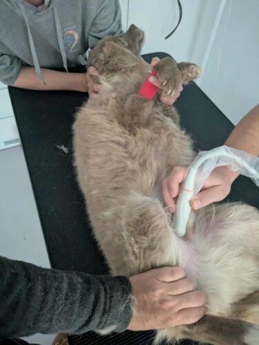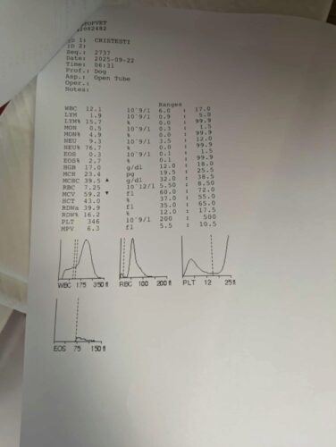 22 septembre 2025 : On a emmené Cristesti à la clinique il y a quelques jours. Il boitait et était raide depuis quelques temps, des radiographies ont été faites et ne montraient rien d’anormal. On l’a remmené aujourd’hui parce qu’il avait du sang dans les urines. Une échographie a été réalisée et met en évidence une grosse cystite et un début de néphrite. Le bilan sanguin (biochimie et NFS) est bon.