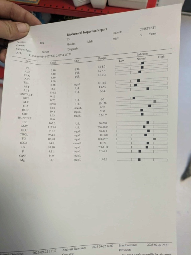 22 septembre 2025 : On a emmené Cristesti à la clinique il y a quelques jours. Il boitait et était raide depuis quelques temps, des radiographies ont été faites et ne montraient rien d’anormal. On l’a remmené aujourd’hui parce qu’il avait du sang dans les urines. Une échographie a été réalisée et met en évidence une grosse cystite et un début de néphrite. Le bilan sanguin (biochimie et NFS) est bon.