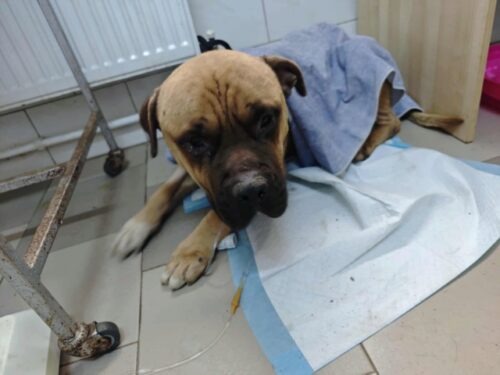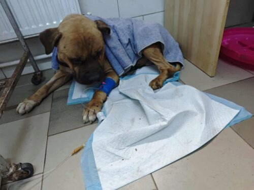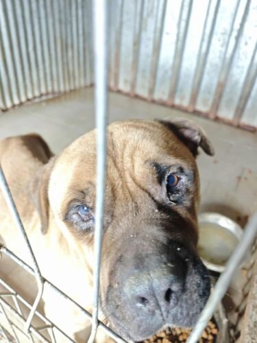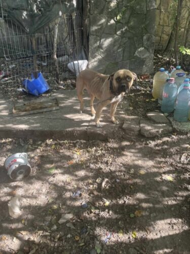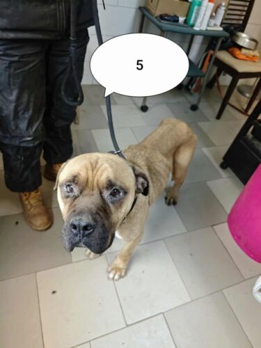 History : Nous avons été le chercher à Targu Frumos. Sur la demande de la police, on a dû aller chercher une femelle avec ses chiots chez le monsieur chez qui on avait déjà récupéré six chiens il y a deux ans… (Willy, Rookie, Caipirinha, Ulysse, ACDC, Grisette). On a récupéré la chienne, puis le monsieur m’a demandé si je voulais aussi prendre son « boxer ». On est allées le voir, il était rachitique, attaché à une courte chaîne et tournait en rond, on n’a pas pu le laisser là donc on l’a pris