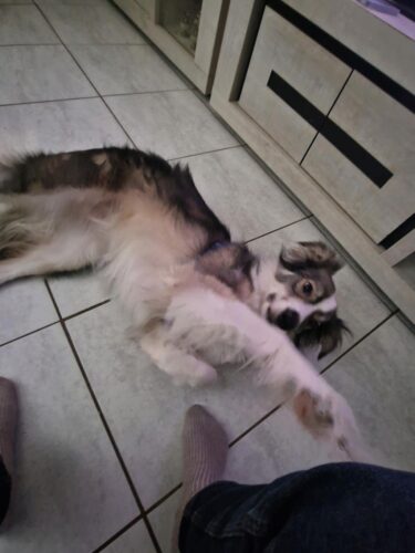 7 mai 2025 : History de plus en plus à l’aise avec moi, en promenade elle a encore beaucoup de craintes, et quand quelqu’un vient chez moi elle va se cacher. Sinon elle est adorable, commence a apprécier les câlins