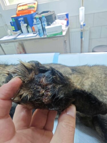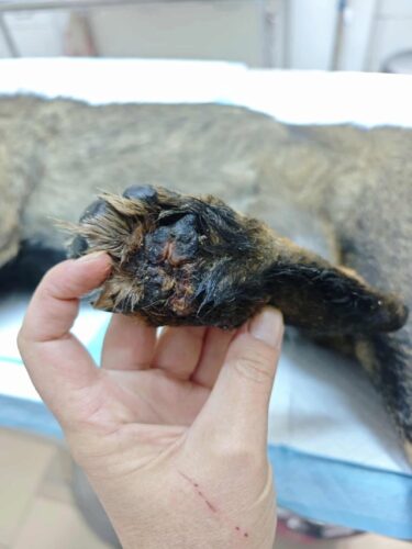 History : trouvée errante. Sa patte arrière droite semble avoir été prise dans un piège avec un câble, le coussinet métatarsien a également été touché. La plaie a été nettoyée.