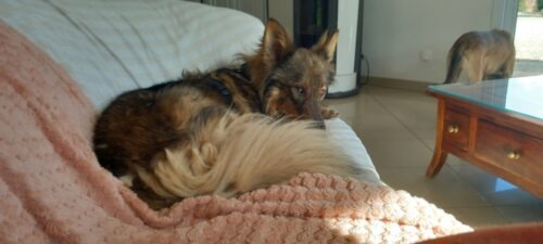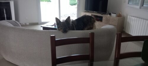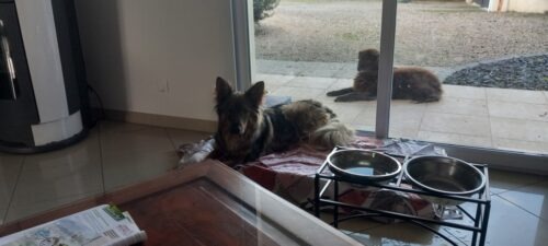 1er octobre 2025 : On l’a sorti de la cage. Du coup, elle s’est installée sur son matelas…et ne le quitte plus… elle mange et boit depuis lundi…et a enfin fait ses besoins hier matin.. et pour l’instant elle fait tout sur son matelas… je n’arrête pas de laver.. elle se laisse toucher sans souci mais c’est comme pour Bingo au début c’est une contrainte pour elle. Elle ne réagit pas du tout aux autres chiens ou aux chats. On lui laisse le temps