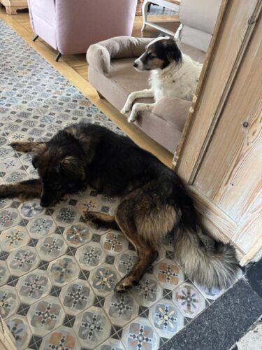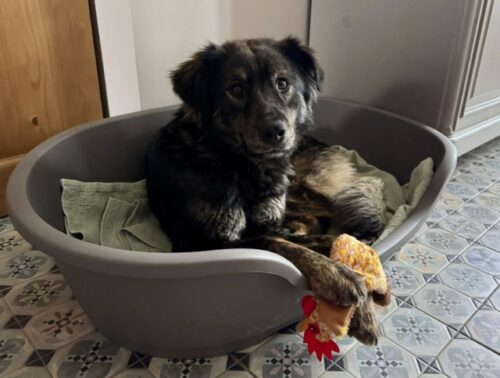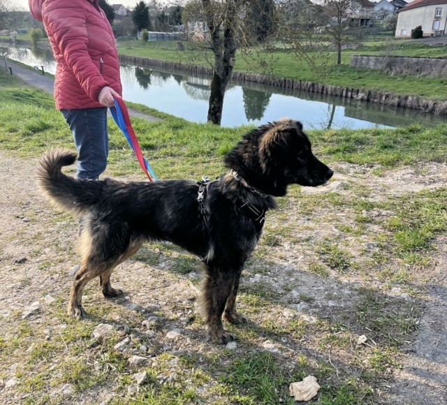 Character : 25 mars 202 : Des nouvelles de Sixteen arrivée samedi à la maison. Elle a 18 mois, doit prendre du poids. Elle mange bien, dort bien, elle est propre et calme. Elle découvre avec grand plaisir le confort d’une maison, d’un panier et pousse de grand soupirs de satisfaction. Dehors, son endroit préféré est la cour devant la maison d’où elle observe ce qui se passe dans la rue. Elle a fait trois promenades dans le village, elle sent, observe, ne tire pas la laisse, c’est agréable. Et une promenade dans la nature, elle apprécie, boit dans la rivière et veut se rouler sur les crottes de gibier. On lui a donné une douche sans problème (elle aime les papouilles). Elle s’entend avec les chats, veut jouer avec Cannelle notre golden retriever (qui est réticente parce que Sixteen est un peu « bourrine»). Elle n’a fait aucune bêtise et découvre les jouets pour chien. Elle a souffert de la faim et fait de la protection de gamelle.
