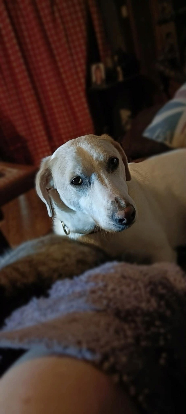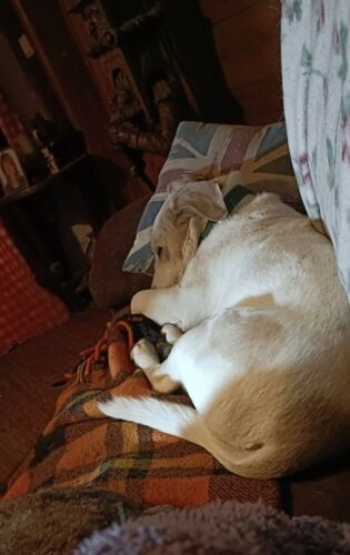 2 Janvier 2025 : Alistair progresse encore et toujours, même si cela se fait à son rythme, c’est à dire doucement mais… sûrement. Alistair est vraiment un chien hyper craintif, constamment sur le « qui-vive ». Le moindre bruit (même celui qu’il fait lui-même !), c’est « sauve-qui-peut ». Parfois, c’est tellement fort qu’il glisse sur le plancher en voulant s’enfuir à toute vitesse. Avoir grandi dans un refuge entouré d’autres chiens parfois agressifs, j’imagine, a du lui créer un état d’alerte permanent, ce qui ne rend pas forcément les choses faciles aujourd’hui, alors qu’il pourrait, maintenant, baisser la garde…