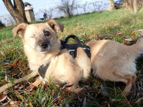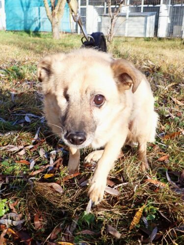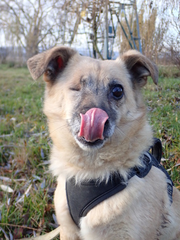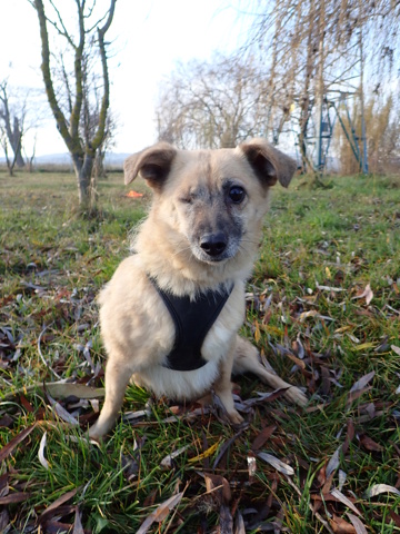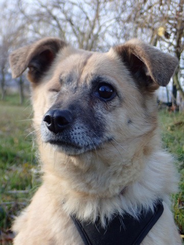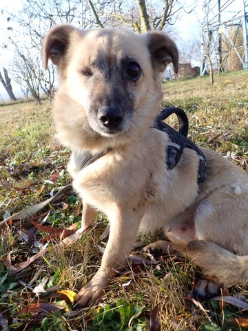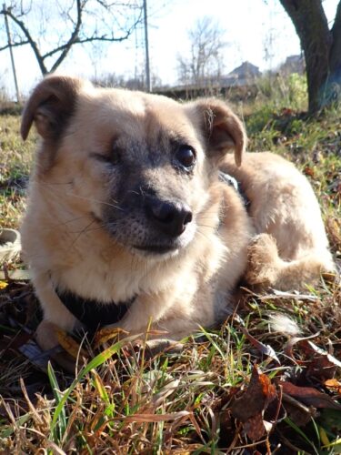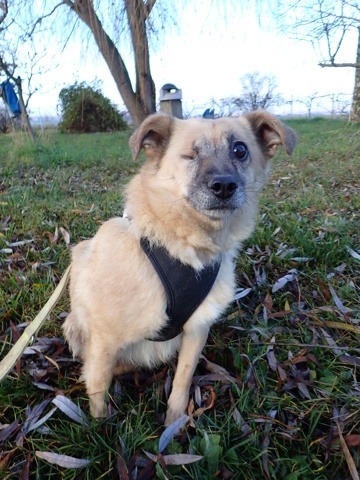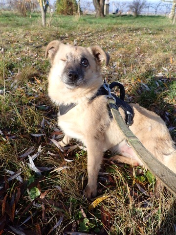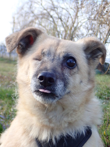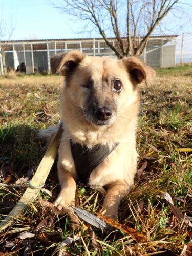 Histoire : saisie par la protection animale de Neamt. Borgne, elle a perdu un oeil dans une bagarre avec un autre chien, elle s’est faite attaquer…elle a une patte très abîmée probablement fracturée