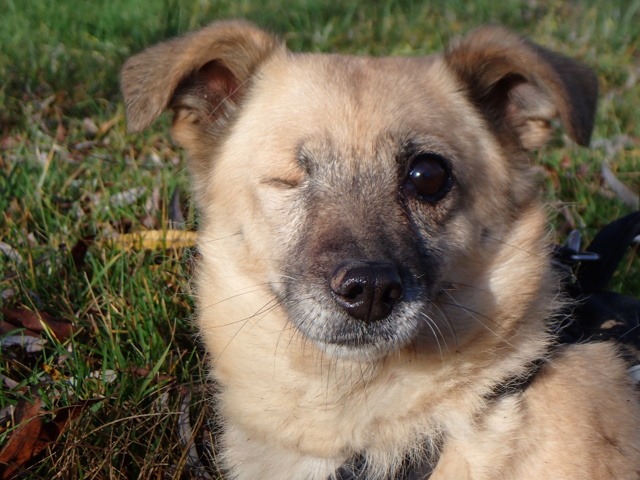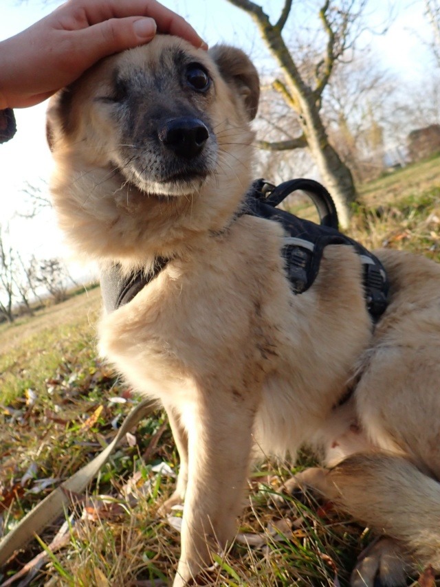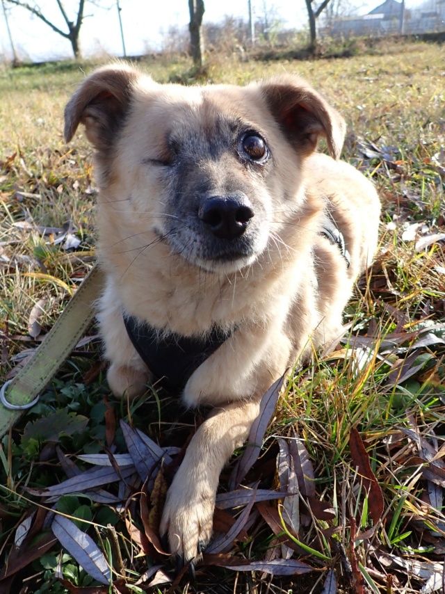 Histoire : saisie par la protection animale de Neamt. Borgne, elle a perdu un oeil dans une bagarre avec un autre chien, elle s’est faite attaquer…elle a une patte très abîmée probablement fracturée