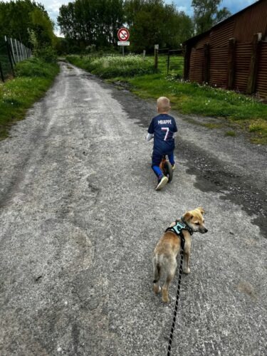 Pas d’enfant car s’ils courent ou sont énergiques à côté de lui il va mordre. Je pense à un homme seul ou couple avec terrain pour pouvoir courir. Il adore sortir et renifler toutes les odeurs.