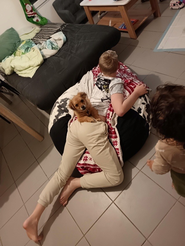 Nos chiots cohabitent avec d’autres chiens, mais ne côtoient pas d’enfants ou de chats au refuge ; au vu de leur jeune âge, nous n’effectuons pas de test chat avec eux puisque nous partons du principe qu’en les sociabilisant correctement, ils peuvent tout à fait s’habituer à la vie de famille avec différentes espèces. C’est à vous de leur apprendre à vivre en harmonie avec vos autres animaux et vos enfants, qui doivent se montrer respectueux à l’égard du nouveau venu. Une cohabitation saine et apaisée met plusieurs semaines, voire mois à se mettre en place. Patience est de mise pour que tout le monde trouve sa place.
