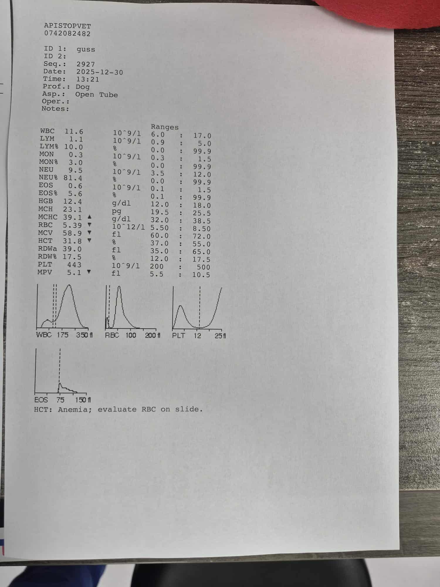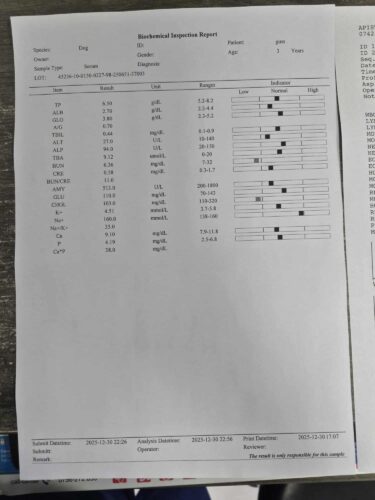 Caractère : 2 janvier 2026 : GUSS a eu un bilan sanguin, il présente une légère anémie, et son faible taux d’urée sanguine indique une malnutrition.