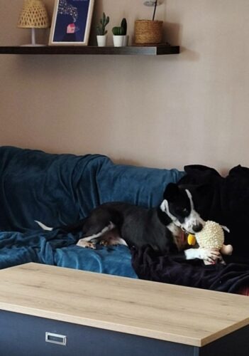 – Quel profil de famille conviendrait selon vous ? (Habitation, environnement, enfants, routine de vie / sorties) : Actuellement Kenjy est habitué à sortir à la fois en ville en laisse (avec beaucoup de voitures, de piéton, des vélos, des coureurs…) mais également dans des champs en campagne. Il adore les autres chiens, je pense qu’il serait très heureux si il arrivait dans une famille avec d’autres chiens, mais il peut aussi vivre seul. Actuellement il a l’habitude de rester seul à la maison (je suis présente seulement la demi journée. Donc il passe des demis journées de 5h tout seul). Il ne détruit pas. Il aime bien aller dans le jardin mais il n’y fait pas grand chose si il est tout seul. Il a besoin que son humain joue avec lui. Il aime beaucoup se promener et respirer plein d’odeurs. Actuellement je le sort 1 fois le matin environ 30 minutes, et une fois le soir environ 45 minutes.